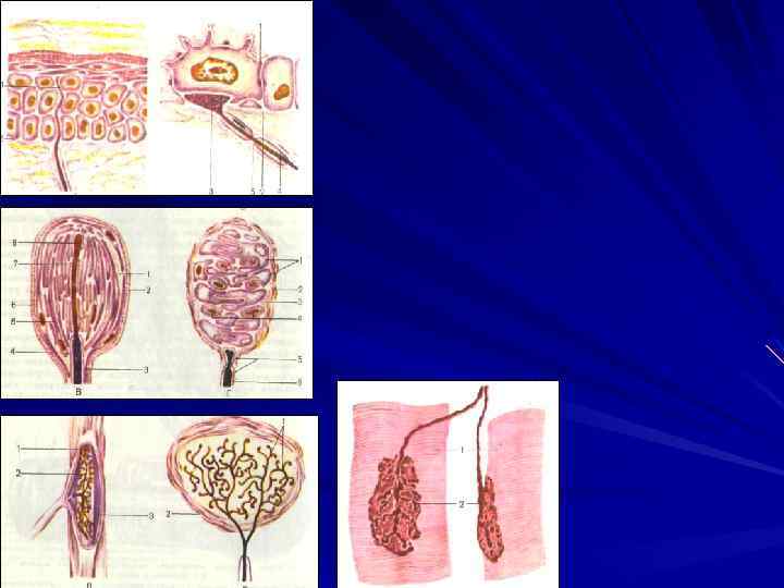 Нервные окончания: Это концевые аппараты дендритов и аксонов, которыми они оканчиваются в органах (тканях) или на других н. к. Различают 3 группы н. окончаний: 1. Эффекторы (двигат) — концевой аппарат аксона в поперечнополосатых и гладких мышцах и в железах. Передает нервный импульс в ткани рабочих органов, (в попер, пол. ткани — моторная бляшка). 2. Рецепторы (чувств) - концевой аппарат дендритов. Воспринимает раздражения как внешней так и внутренней среды, и трансформирует (преобразует) энергию этого раздражения в нервный импульс 3. Межнейронные контакты (синапсы) - -служат для передачи нервного импульса с одной н. к. на другую.