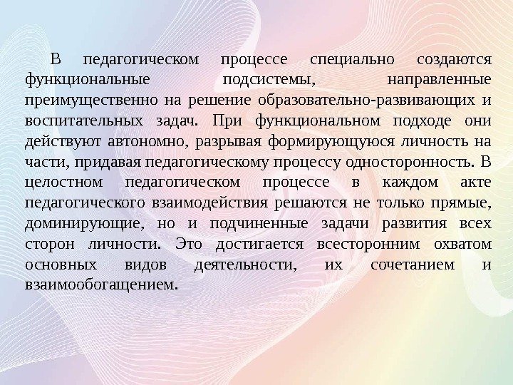 В педагогическом процессе специально создаются функциональные подсистемы, направленные преимущественно на решение образовательно-развивающих и воспитательных задач. При функциональном подходе они действуют автономно, разрывая формирующуюся личность на части, придавая педагогическому процессу односторонность. В целостном педагогическом процессе в каждом акте педагогического взаимодействия решаются не только прямые, доминирующие, но и подчиненные задачи развития всех сторон личности. Это достигается всесторонним охватом основных видов деятельности, их сочетанием и взаимообогащением.
