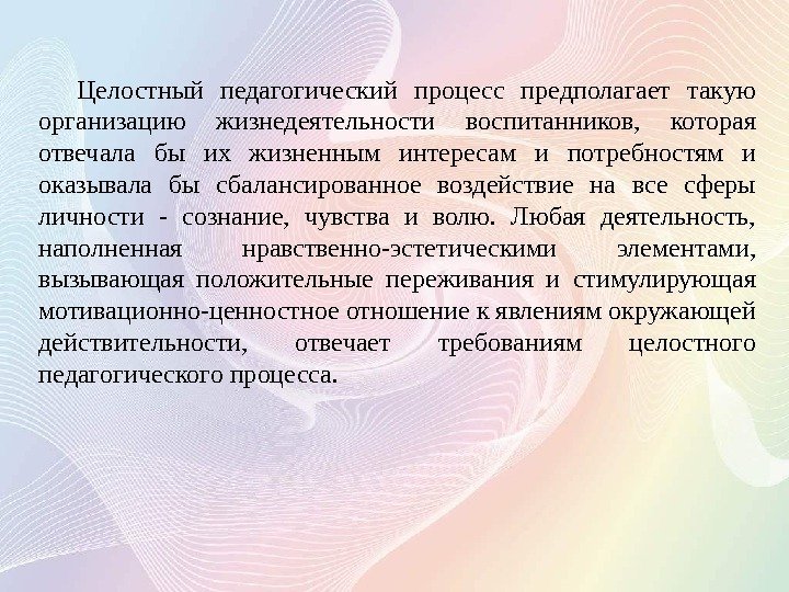 Целостный педагогический процесс предполагает такую организацию жизнедеятельности воспитанников, которая отвечала бы их жизненным интересам и потребностям и оказывала бы сбалансированное воздействие на все сферы личности — сознание, чувства и волю. Любая деятельность, наполненная нравственно-эстетическими элементами, вызывающая положительные переживания и стимулирующая мотивационно-ценностное отношение к явлениям окружающей действительности, отвечает требованиям целостного педагогического процесса.