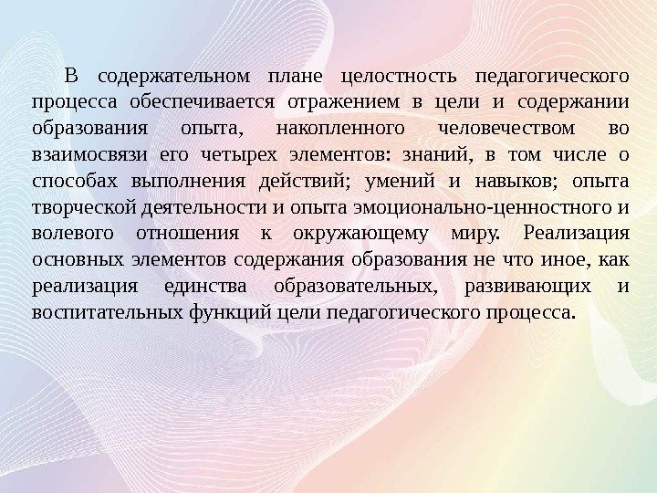 В содержательном плане целостность педагогического процесса обеспечивается отражением в цели и содержании образования опыта, накопленного человечеством во взаимосвязи его четырех элементов: знаний, в том числе о способах выполнения действий; умений и навыков; опыта творческой деятельности и опыта эмоционально-ценностного и волевого отношения к окружающему миру. Реализация основных элементов содержания образования не что иное, как реализация единства образовательных, развивающих и воспитательных функций цели педагогического процесса.