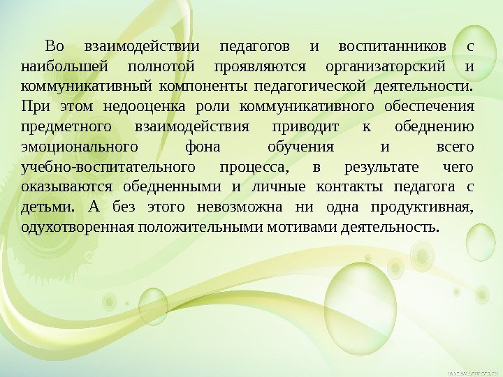 Во взаимодействии педагогов и воспитанников с наибольшей полнотой проявляются организаторский и коммуникативный компоненты педагогической деятельности. При этом недооценка роли коммуникативного обеспечения предметного взаимодействия приводит к обеднению эмоционального фона обучения и всего учебно-воспитательного процесса, в результате чего оказываются обедненными и личные контакты педагога с детьми. А без этого невозможна ни одна продуктивная, одухотворенная положительными мотивами деятельность.