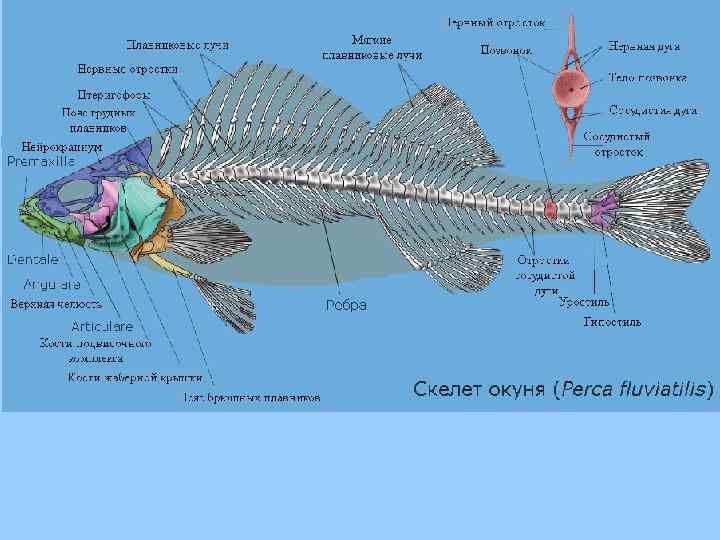 Парные плавники, по сути представляют собой парные конечности, опирающиеся на соответствующие им внутренние скелетные элементы — пояса плавников. У подавляющего большинства рыб представлены двумя парами плавников: грудным плавником (лат. pinna pectoralis, обозначается латинской буквой P) и брюшным плавником (лат. pinna ventralis, обозначается заглавной латинской буквой V). У некоторых рыб могут отсутствовать брюшные, а в редких случаях — и грудные плавники. Позвоночник рыб состоит из отдельных, не сращённых позвонков. Позвонки рыб амфицельные (то есть обе их торцевые поверхности вогнутые), между позвонками находится хрящевая прослойка; невральные дуги, расположенные сверху над телами позвонков, формируют позвоночный канал, защищающий спинной мозг. Позвоночник делится на два отдела — туловищный и хвостовой. От позвонков туловища в стороны отходят рёберные отростки, к которым крепятся рёбра. В хвостовом отделе позвоночника боковых отростков нет, зато кроме невральной дуги имеется сосудистая (гемальная) дуга, которая прикрепляется к позвонку снизу и защищает проходящий в ней большой кровеносный сосуд — брюшную аорту. От невральных и гемальных дуг вертикально вверх и вниз отходят заострённые остистые отростки.