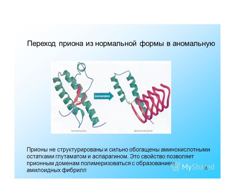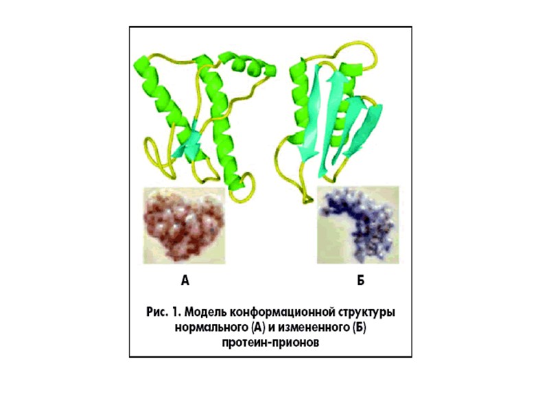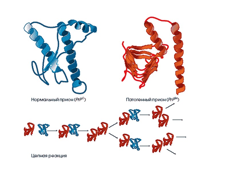 Прионы Прионный белок может существовать в двух формах: нормальная клеточная форма(РrPc), инфекционная форма (PrPs) .