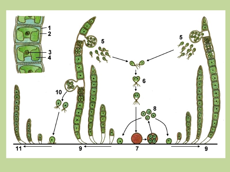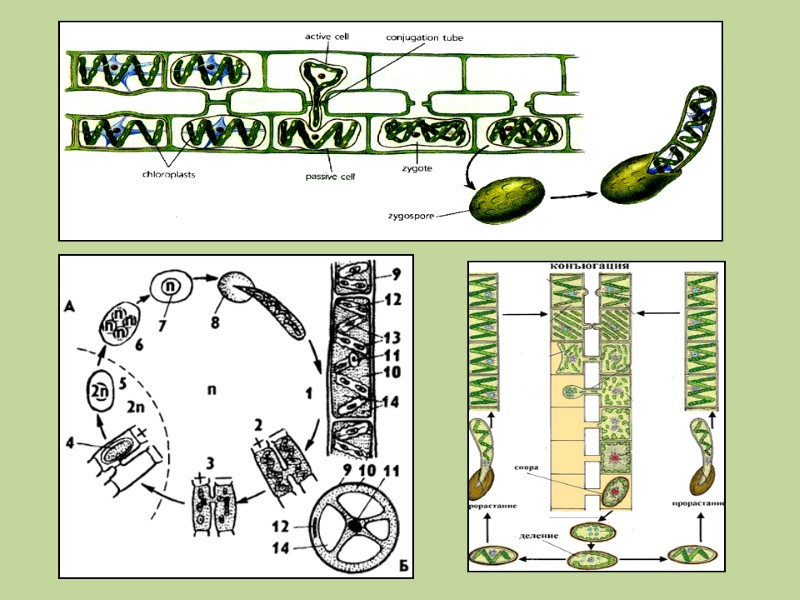 Нитчатые водоросли до 8-10 см. Скопления нитей спирогиры образуют тину. Снаружи водоросль окружена слизистым чехлом. Бесполое размножение осуществляется частями нитей при их случайном разрыве. Половой процесс осуществляется путем конъюгации. Конъюгация может быть лестничной и боковой. При лестничной- конъюгируют клетки двух нитей, расположенных параллельно друг другу. При боковой - оплодотворение происходит в пределах одной нити. При этом наблюдается слияние протопластов двух рядом расположенных клеток. Весной зигота редукционно делится и образует четыре гаплоидных ядра. Три ядра дегенерируют, а четвертое разрывает клеточную стенку, делится митотически и дает начало новой гаплоидной нити. Отдел зеленые водоросли. Спирогира