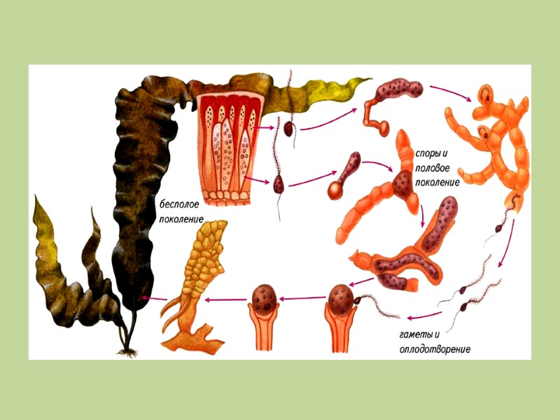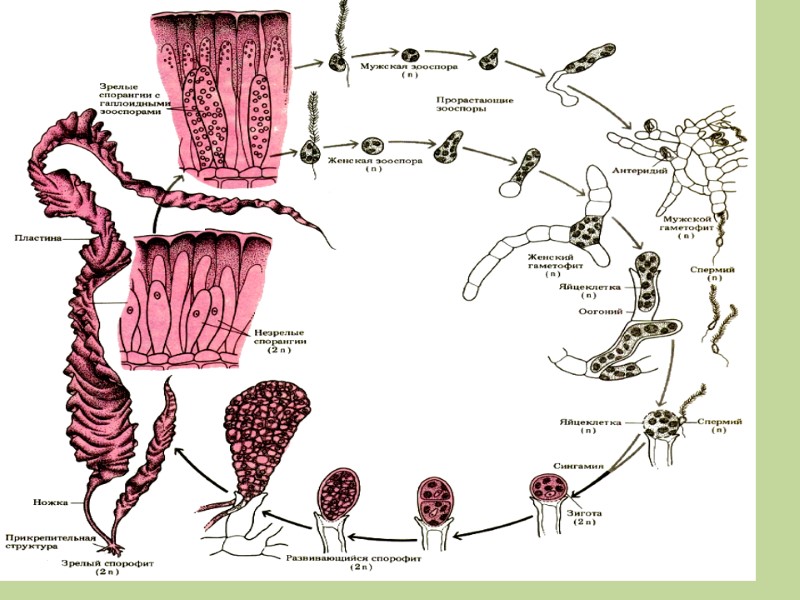 Они прорастают в микроскопические нитчатые двудомные гаметофиты, на которых образуются половые органы, антеридии и оогогнии. Половой процесс оогамный. Бурые водоросли. Ламинария В оогониях и антеридиях образуется по одной гамете. Из зиготы без периода покоя развивается диплоидный спорофит. Ламинарию используют в пищу, для лечебного питания.