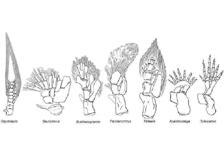 • На территории Латвии в 1960 -м г. были обнаружены окаменелости вентастеги (Ventastega). Относятся они к верхнему девону. Реконструкция облика вентастеги примерно такая. На голове с лопатообразным тупым рылом сидели сдвинутые назад небольшие глаза. За глазами расположен теменной глаз, а вперед от глаз и до конца морды расширяется треугольная депрессия. В средней части этой депрессии имелся неокостеневший участок. Широкая челюсть была усажена мелкими острыми зубами, среди которых выделялись увеличенные «клыки» . На длинном теле — около метра-полутора в длину — имелись две пары коротеньких конечностей с пальцами (сколько пальцев — неизвестно) и сзади хвост с плавником, который поддерживали плавниковые лучи около 7 см в длину. По сравнению с другими девонскими четвероногими у него было увеличено дыхательное отверстие. • Одним из наиболее примитивных истинных тетрапод была позднедевонская акантостега (Acanthostega) из отложений восточной Гренландии. Акантостега достигала длины около 60 см. Конечности не имели запястий, что говорит о крайне низкой приспособленности к передвижению по суше, и на каждой из них насчитывалось 8 пальцев. Строение скелета указывает на наличие внутренних жабр. Слабые конечности, которые не смогли бы выдержать вес животного, и короткие рёбра, говорят о его преимущественно водном образе жизни.