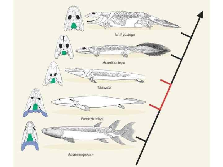 • Переход позвоночных от водного к наземному образу жизни и появление земноводных сопровождалось появлением двух решающих приспособлений: дыхания кислородом атмосферы и передвижения по твёрдому субстрату, жаберное дыхание должно было замениться лёгочным, а конечности типа плавника — пятипалыми конечностями, представляющими собой многочленный рычаг, служащий для опоры тела о твёрдый субстрат. Приспособления к наземности независимо и параллельно развивались в нескольких линиях эволюции кистепёрых рыб отряда Рипидистиеобразные (Osteolepidiformes). Одной из наиболее «продвинутых» кистепёрых рыб являлся тиктаалик (Tiktaalik), имевший ряд переходных признаков, сближающих его с земноводными. К таким признакам относятся укороченный череп, отделенная от пояса передних конечностей и относительно подвижная голова, наличие локтевого и плечевого суставов. Плавник тиктаалика мог занимать несколько фиксированных положений, одно из которых предназначалось для того, чтобы животное могло находиться в приподнятом положении над грунтом (вероятно, чтобы «ходить» на мелководье). Тиктаалик дышал через ноздри, расположенные на конце плоской «крокодильей» морды. Воду, а возможно и атмосферный воздух в лёгкие нагнетали уже не жаберные крышки, а щёчные помпы. Некоторые из указанных приспособлений характерны также для кистепёрой рыбы пандерихтис (Panderichthys). Часто кистеперых рыб с явно наметившимися признаками «тетраподизации» выделяют в инфракласс Tetrapodomorpha.