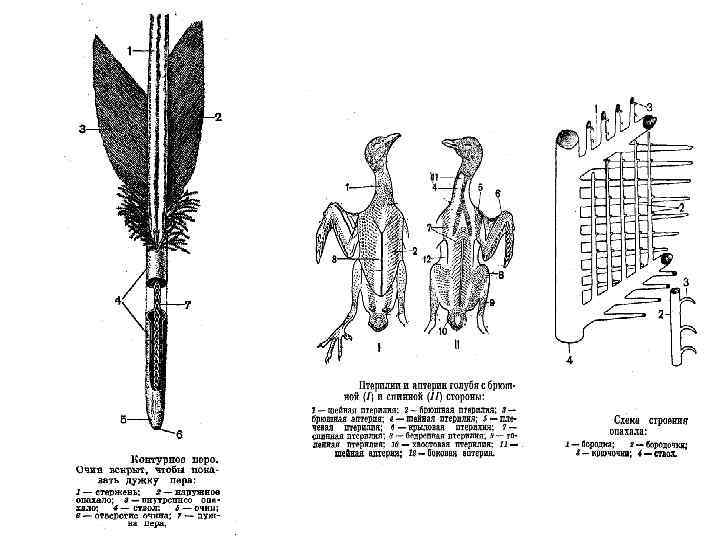 • Основной тип пера - контурное перо. Длинные и особо прочные перья образуют плоскость крыла; их называют маховыми перьями. Длинные и прочные перья, образующие плоскость хвоста, называют рулевыми. Под контурными перьями лежат пуховые перья и пух. Пух и пуховые перья обеспечивают теплоизоляцию. У многих птиц по всему телу расположены нитевидные перья с тонким стволом и редкими короткими бородками. Контурные перья, покрывающие все тело птицы, укреплены в коже на особых полях - птерилиях, разделенных аптериями - участками кожи, на которых перья не растут. Регулярно происходит смена пера - линька. • Своеобразная особенность скелета птиц - хорошо выраженная пневматичность костей. Плоские кости имеют губчатое строение, сохраняя большую прочность при небольшой толщине. Трубчатые кости тоже тонкостенны, а полости внутри них заполнены частично воздухом. Эти особенности обеспечивают повышенную прочность отдельных костей и заметно их облегчают. Челюсти лишены зубов. В позвоночнике подвижными остается только шея и начало хвостового отдела, подвижность остального позвоночника ограничена, что обеспечивает опору при полете. Большая грудина имеет вид тонкой широкой и длинной пластинки, на которой у большинства птиц расположен высокий киль грудины. Большие размеры грудины и ее киля обеспечивают место для прикрепления мощных мышц, двигающих крыло.