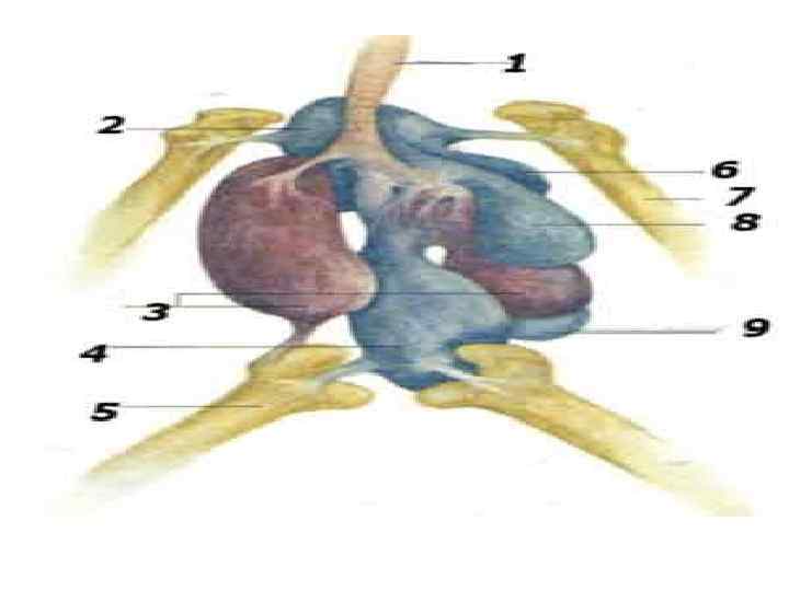 1 - трахея 2 - межключичный воздушный мешок 3 - легкие 4 - абдоминальный воздушный мешок 5 - бедро (бедренная кость) 6 - шейный воздушный мешок 7 - плечевая кость 8 - передний грудной воздушный мешок 9 - задний грудной воздушный мешок