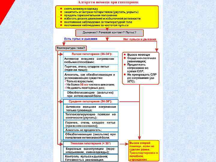 Помощь при переохлаждении Обязательное требование к оказывающим помощь - соблюдать крайнюю осторожность при любых пе- ремещениях пострадавшего и манипуляциях с ним (опасность внезапной смерти)