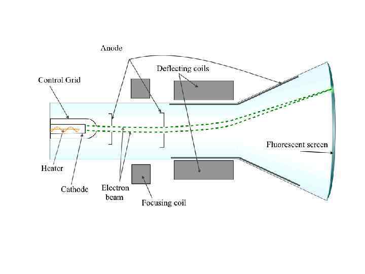 1. 2. 3. 4. 5. 6. 7. 8. Electron guns Electron beams Focusing coils Deflection coils Anode connection Mask for separating beams for red, green, and blue part of displayed image Phosphor layer with red, green, and blue zones Close-up of the phosphor-coated inner side of the screen