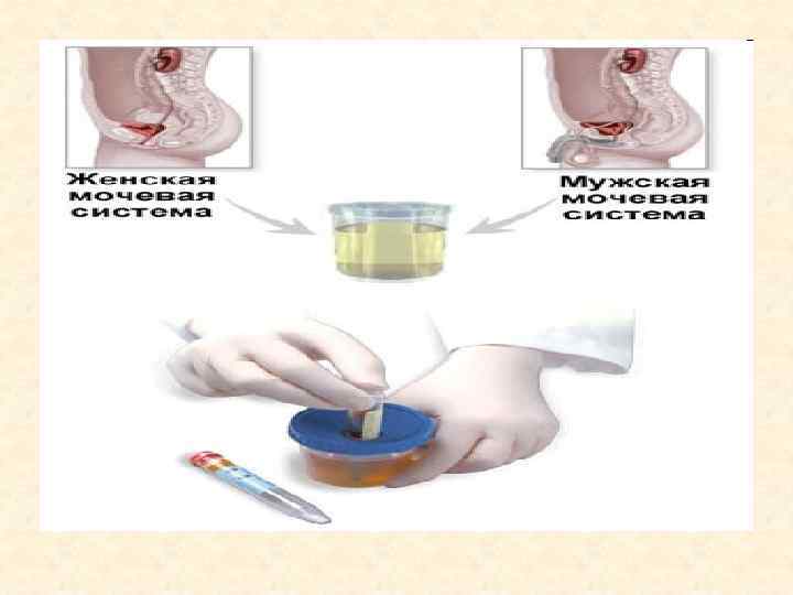 Общий анализ мочи Включает определение физических свойств, химического состава и микроскопическое изучение осадка • Физические свойства: количество, цвет, прозрачность, плотность • Химический состав: р. Н, белок, глюкоза, билирубин, уробилиноген, кетоновые тела, нитриты, лейкоциты, эритроциты, гемоглобин • Микроскопическое исследование осадка мочи: эпителий (плоский, клетки переходного эпителия, клетки эпителия мочевых канальцев), лейкоциты, эритроциты, цилиндры (гиалиновые, эпителиальные, зернистые, восковидные, эритроцитарные, лейкоцитарные, цилиндроиды), соли и др. элементы (соли мочевой кислоты, аморфные ураты, оксалаты, фосфаты, кислый мочекислый аммоний, кристаллы цистина, лейцина, тирозина, холестерина, жирные кислоты, гемосидирин, гематоидин), бактерии, грибы дрожжевые, простейшие.