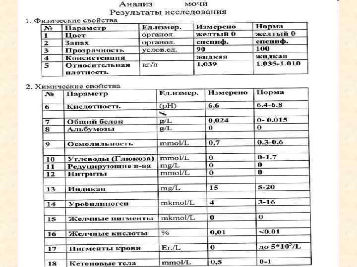 Физические свойства мочи - Цвет в норме соломенно-желтый (урохрома) Красный цвет или мясных помоев: макрогематурия или гемоглобинурия, миоглобинурия, порфиринурия Темно-желтый, иногда с зеленым или зеленоватобурым оттенком: паренхиматозная, механическая желтухи Зеленовато-желтый: большое содержание гноя Грязно-коричневый: или серый: пиурия при щелочной реакции мочи Темный, почти черный цвет: гемоглобинурия, острая гемолитическая анемия, меланинурия при меланоме, меланосаркома Беловатый: фосфатурия, липурия при инвазии паразита Filaria