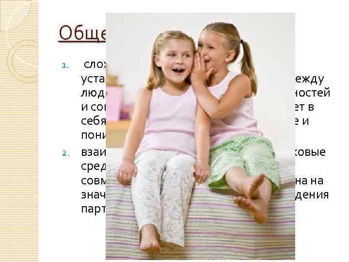 Общение-это: сложный, многоплановый процесс установления и развития контактов между людьми, возникает на основе потребностей и совместной деятельности и включает в себя обмен информацией, восприятие и понимание другого 2. взаимодействие субъектов через знаковые средства, вызванное потребностями совместной деятельности и направлена на значимые изменения состояния, поведения партнера. 1.
