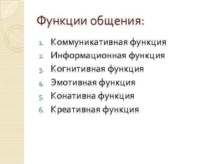 Функции общения: 1. 2. 3. 4. 5. 6. Коммуникативная функция Информационная функция Когнитивная функция Эмотивная функция Конативна функция Креативная функция