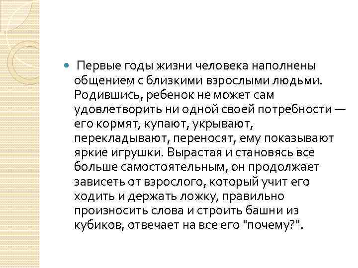 Первые годы жизни человека наполнены общением с близкими взрослыми людьми. Родившись, ребенок не может сам удовлетворить ни одной своей потребности — его кормят, купают, укрывают, перекладывают, переносят, ему показывают яркие игрушки. Вырастая и становясь все больше самостоятельным, он продолжает зависеть от взрослого, который учит его ходить и держать ложку, правильно произносить слова и строить башни из кубиков, отвечает на все его "почему? ".