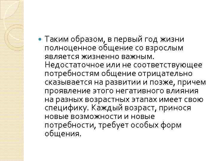 Таким образом, в первый год жизни полноценное общение со взрослым является жизненно важным. Недостаточное или не соответствующее потребностям общение отрицательно сказывается на развитии и позже, причем проявление этого негативного влияния на разных возрастных этапах имеет свою специфику. Каждый возраст, принося новые возможности и новые потребности, требует особых форм общения.