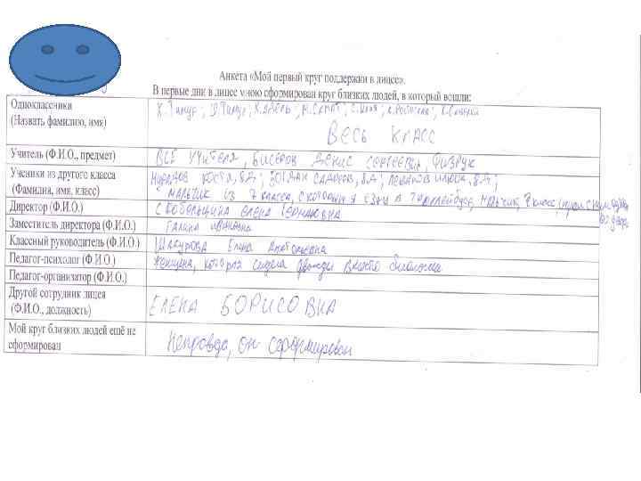 Диагностические исследования Анкета «Мой первый круг поддержки в лицее» В первые дни в лицее мною сформирован круг близких людей, в который вошли: