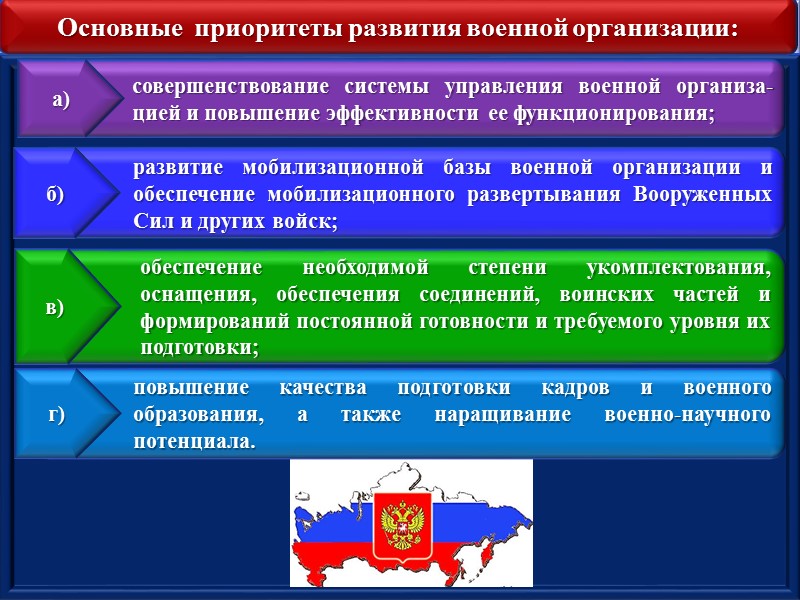 Основные приоритеты развития военной организации: совершенствование системы управления военной организа-цией и повышение эффективности ее функционирования; а) развитие мобилизационной базы военной организации и обеспечение мобилизационного развертывания Вооруженных Сил и других войск; б) обеспечение необходимой степени укомплектования, оснащения, обеспечения соединений, воинских частей и формирований постоянной готовности и требуемого уровня их подготовки; в) повышение качества подготовки кадров и военного образования, а также наращивание военно-научного потенциала. г)