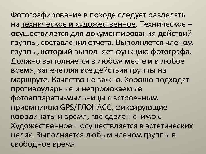 Фотографирование в походе следует разделять на техническое и художественное. Техническое – осуществляется для документирования действий группы, составления отчета. Выполняется членом группы, который выполняет функцию фотографа. Должно выполняется в любом месте и в любое время, запечетляя все действия группы на маршруте. Качество не важно. Хорошо подходят противоударные и непромокаемые фотоаппараты-мыльницы с встроенным приемником GPS/ГЛОНАСС, фиксирующие координаты и время, где сделан снимок. Художественное – осуществляется в эстетических целях. Выполняется любым членом группы в свободное время