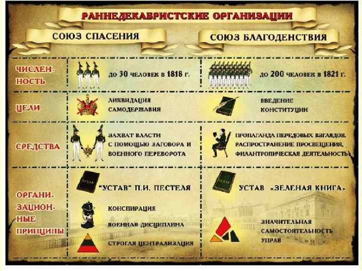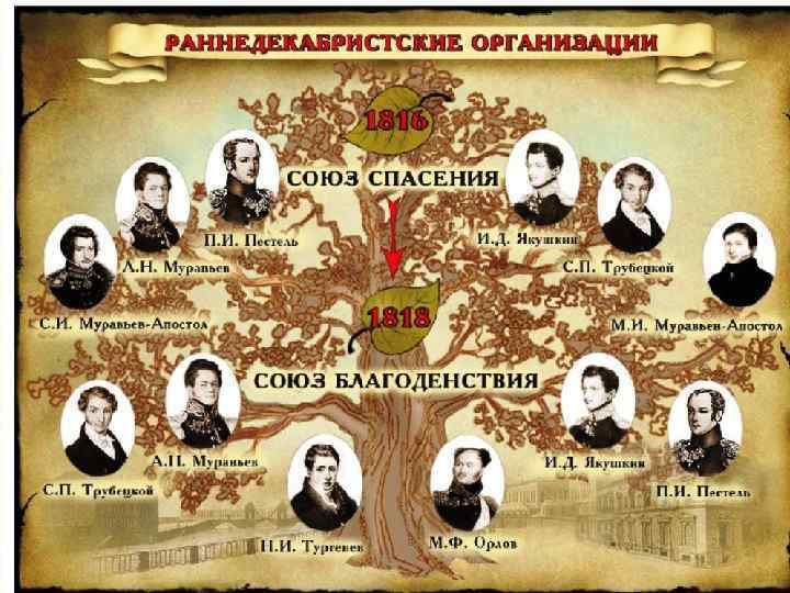 Тайные общества начала XIX века Название, годы существования «Союз спасения» 1816 -1818 «Союз благоденствия» 1818 -1820 Южное общество 1821 -1825 Северное общество 1821 -1825