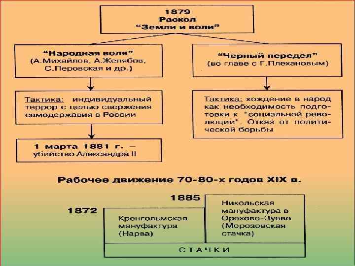 Причин раскола «Земли и воли» было несколько. И несогласие многих на продолжение террора и неудачи хождения в народ. «Народная воля» продолжила путь террора, а «Черный передел» , перешел на мирную программу.
