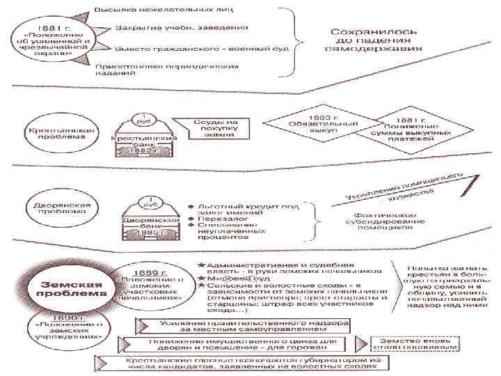 Идеологи: К. П. Победоносцев, Д. А. Толстой, В. П. Мещерский Контрреформы Печать и образование 1882 г. Ужесточение цензуры. Закрытие либеральных газет и журналов ( «Отечественные записки» , «Дело» …) 1884 г. Реакционный университетский устав. Отмена университетского самоуправления. 1887 г. Циркуляр «О кухаркиных детях» (запрет приема в гимназии детей низших сословий) Местное самоуправление Судебная контрреформа Земские начальники (из дворян) для усиления контроля за крестьянским самоуправлением Ограничены права и полномочия земств Увеличено число депутатов от дворян за счет числа депутатов от других сословий Принят чрезвычайный закон для борьбы с революционным движением (1881) Ограничена открытость судопроизводства по политическим делам (1887) Ликвидированы мировые суды (1889)