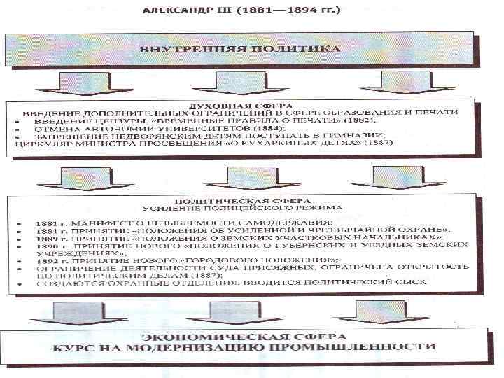 Политика в отношении сословий Опора на дворянство (Дворянский поземельный банк, усиление влияния в местных органах управления) Протекционизм в интересах отечественных промышленников Попечительская политика в отношении рабочих (фабрично-заводская инспекция, ограничение труда детей, запрет ночного труда женщин… но запрет забастовок) В отношении крестьян (перевод на обязательный выкуп с 1883 г. , учреждение Крестьянского банка в 1882 г. , отмена подушной подати в 1885 г. )