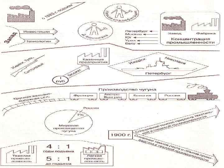 Развитие капитализма в России В сельском хозяйстве Прусский путь Американский путь Центральная Россия Сибирь Русский Север Казачество Превращение помещичьих хозяйств в капиталистические при сохранении феодальной эксплуатации крестьян Вовлечение крестьянских хозяйств в капиталистические отношения (фермеры) В промышленности Переход на наемный труд Активизация железнодорожного строительства Завершение промышленного переворота Новые промышленные регионы: Донбасс и Баку 1897 г. – финансовая реформа С. Ю. Витте; золотой стандарт