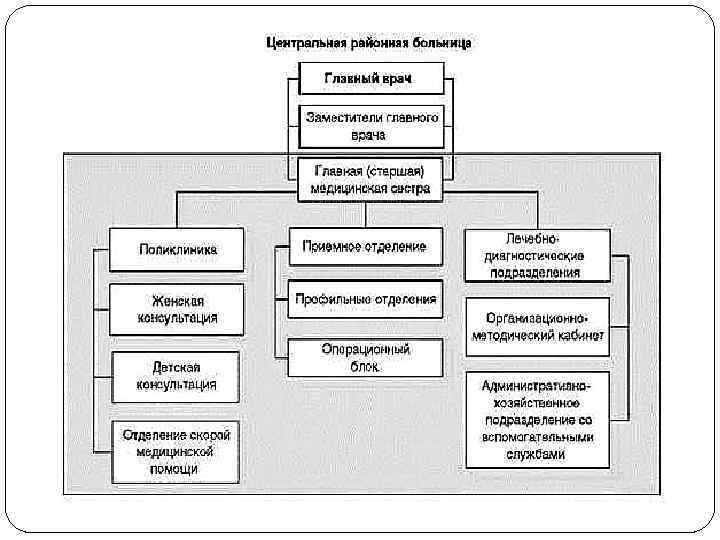 Второй этап обеспечения медицинской помощью сельского населения осуществляют учреждения здравоохранения муниципального района, среди которых ведущее место занимает центральная районная больница (ЦРБ). ЦРБ осуществляет основные виды специализированной квалифицированной медицинской помощи и одновременно выполняет функции органа управления здравоохранением на территории муниципального района. Мощность ЦРБ, как правило, составляет от 100 до 500 коек. Профиль и количество специализированных отделений в составе ЦРБ зависят от ее мощности, однако оптимальное число их должно быть не менее пяти: - терапевтическое; - хирургическое с травматологией, - педиатрическое, - инфекционное, - родильное и гинекологическое (если в районе нет родильного дома).