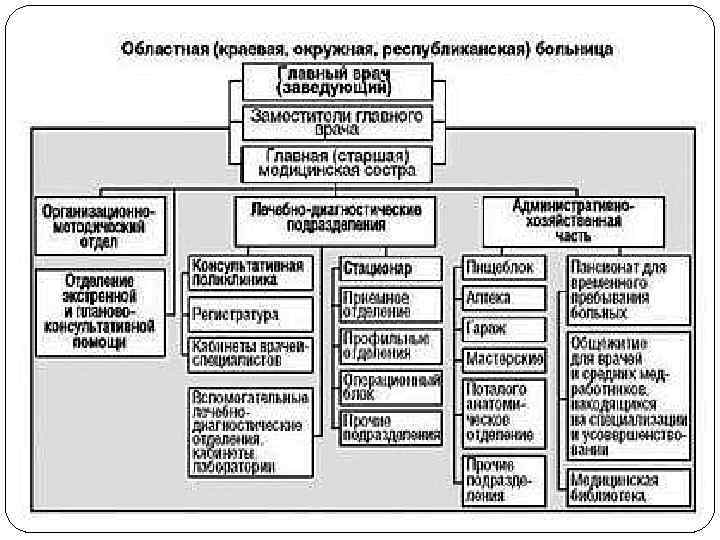 Особенности областной больницы: наличие в составе больницы областной консультативной поликлиники (ОКП), пансионат или гостиница для пациентов, наличием в своем составе отделения экстренной и планово-консультативной помощи - использует средства санитарной авиации или наземного автотранспорта, - оказывает экстренную и консультативную помощь с выездом в отдаленные населенные пункты, - обеспечивает доставку больных в специализированные региональные и федеральные медицинские учреждения. Отделение экстренной и планово-консультативной помощи работает в тесной связи с региональным центром медицины катастроф.