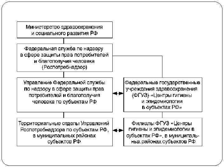 ОРГАНЫ, ОСУЩЕСТВЛЯЮЩИЕ ГОСУДАРСТВЕННЫЙ САНИТАРНОЭПИДЕМИОЛОГИЧЕСКИЙ НАДЗОР И КОНТРОЛЬ В СФЕРЕ ЗАЩИТЫ ПРАВ ПОТРЕБИТЕЛЕЙ НА ПОТРЕБИТЕЛЬСКОМ РЫНКЕ Федеральным органом исполнительной власти, уполномоченным осуществлять функции по контролю и надзору в сфере обеспечения санитарно -эпидемиологического благополучия населения и защиты прав потребителей на потребительском рынке в Российской Федерации, является Федеральная служба по надзору в сфере защиты прав потребителей и благополучия человека (Роспотребнадзор), которая находится в ведении Министерства здравоохранения и социального развития РФ и осуществляет свою деятельность непосредственно и через свои территориальные органы