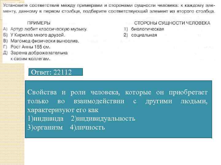 Ответ: 22112 Свойства и роли человека, которые он приобретает только во взаимодействии с другими людьми, характеризуют его как 1)индивида 2)индивидуальность 3)организм 4)личность