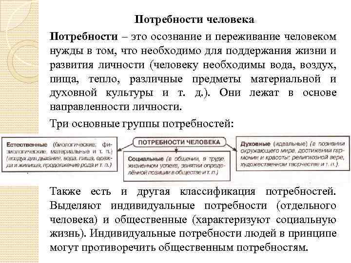 Потребности человека Потребности – это осознание и переживание человеком нужды в том, что необходимо для поддержания жизни и развития личности (человеку необходимы вода, воздух, пища, тепло, различные предметы материальной и духовной культуры и т. д. ). Они лежат в основе направленности личности. Три основные группы потребностей: Также есть и другая классификация потребностей. Выделяют индивидуальные потребности (отдельного человека) и общественные (характеризуют социальную жизнь). Индивидуальные потребности людей в принципе могут противоречить общественным потребностям.