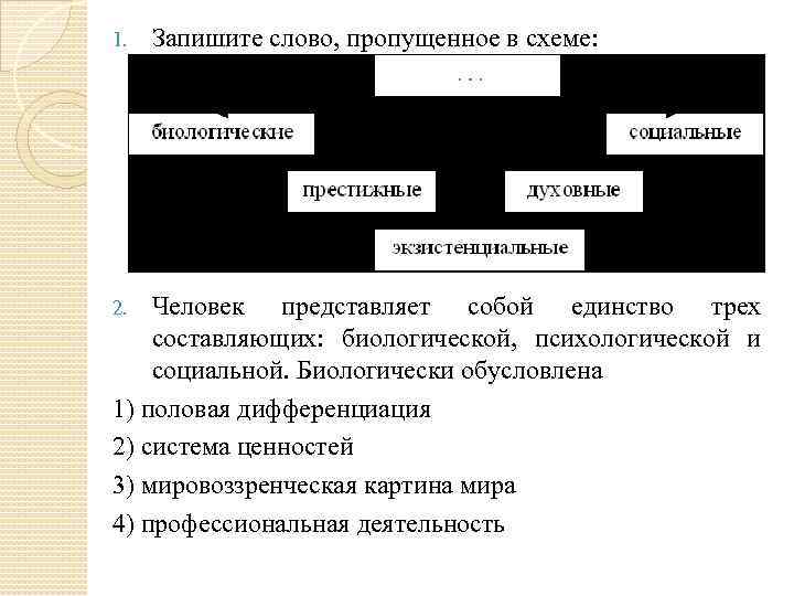 1. Запишите слово, пропущенное в схеме: Человек представляет собой единство трех составляющих: биологической, психологической и социальной. Биологически обусловлена 1) половая дифференциация 2) система ценностей 3) мировоззренческая картина мира 4) профессиональная деятельность 2.