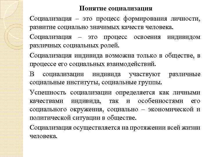 Понятие социализация Социализация – это процесс формирования личности, развитие социально значимых качеств человека. Социализация – это процесс освоения индивидом различных социальных ролей. Социализация индивида возможна только в обществе, в процессе его социальных взаимодействий. В социализации индивида участвуют различные социальные институты, социальные группы. Успешность социализации определяется как личными качествами индивида, так и особенностями его социального окружения, социально – экономической и политической ситуации в обществе. Социализация осуществляется на протяжении всей жизни человека.