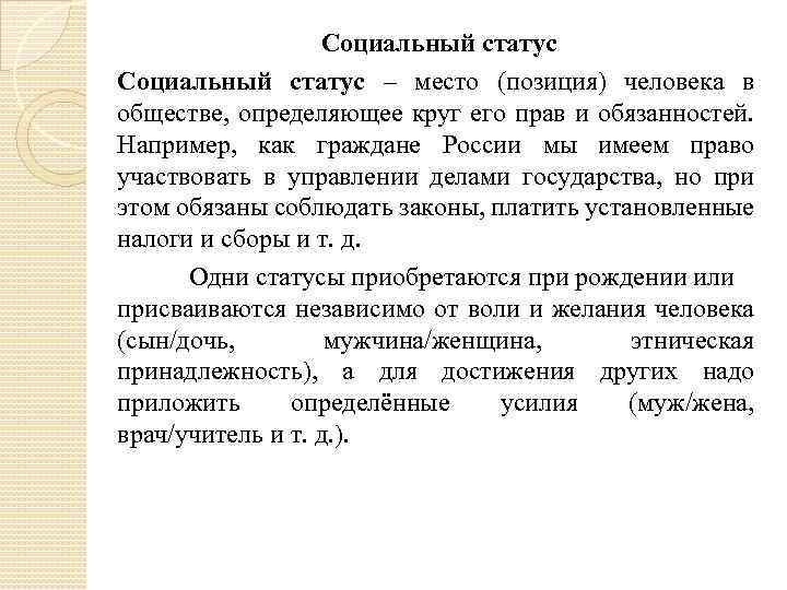 Социальный статус – место (позиция) человека в обществе, определяющее круг его прав и обязанностей. Например, как граждане России мы имеем право участвовать в управлении делами государства, но при этом обязаны соблюдать законы, платить установленные налоги и сборы и т. д. Одни статусы приобретаются при рождении или присваиваются независимо от воли и желания человека (сын/дочь, мужчина/женщина, этническая принадлежность), а для достижения других надо приложить определённые усилия (муж/жена, врач/учитель и т. д. ).
