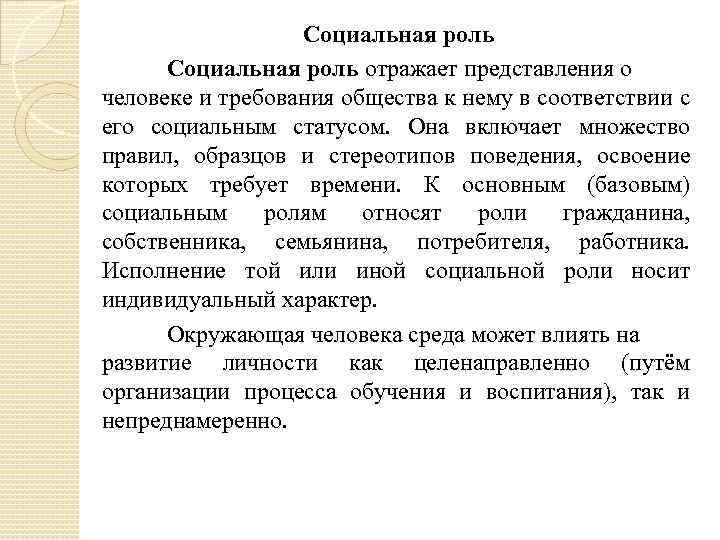 Социальная роль отражает представления о человеке и требования общества к нему в соответствии с его социальным статусом. Она включает множество правил, образцов и стереотипов поведения, освоение которых требует времени. К основным (базовым) социальным ролям относят роли гражданина, собственника, семьянина, потребителя, работника. Исполнение той или иной социальной роли носит индивидуальный характер. Окружающая человека среда может влиять на развитие личности как целенаправленно (путём организации процесса обучения и воспитания), так и непреднамеренно.