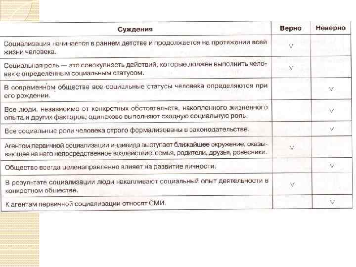 В ходе социализации человек усваивает социальный опыт предыдущих поколений, без чего полноценная жизнь в обществе трудна. Социальный опыт включает в себя систему знаний, норм, ценностей, образцы поведения в типичных ситуациях (социальные роли). Социальный статус и социальная роль Каждый человек занимает определённое положение в обществе. Оно зависит от его возраста, семейного положения, доходов, профессии, политической активности, культурных интересов. Положение человека в обществе связано с его социальным статусом.