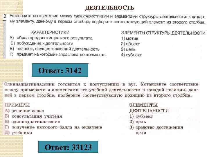 ДЕЯТЕЛЬНОСТЬ Ответ: 3142 Ответ: 33123
