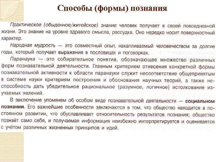 Способы (формы) познания Условно способы познания можно подразделить на научное познание и ненаучное познание (мифы, религия, практическое знание, народная мудрость, паранаука).