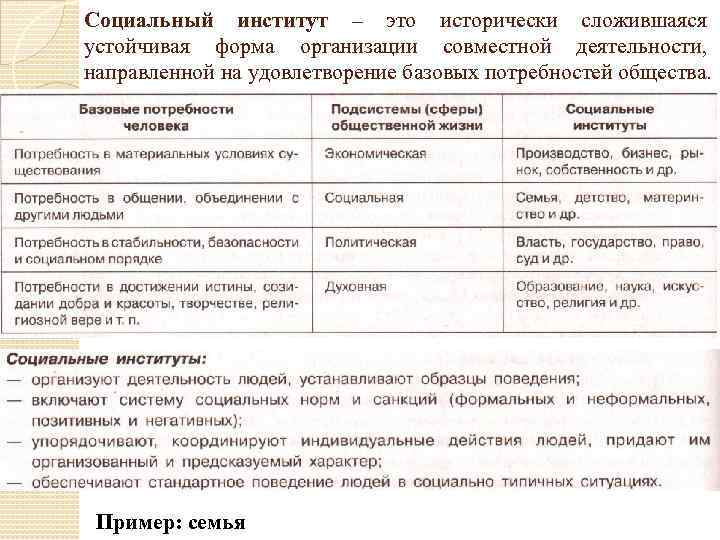 Социальный институт – это исторически сложившаяся устойчивая форма организации совместной деятельности, направленной на удовлетворение базовых потребностей общества. Пример: семья