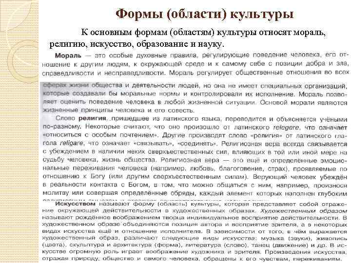 Формы (области) культуры К основным формам (областям) культуры относят мораль, религию, искусство, образование и науку.