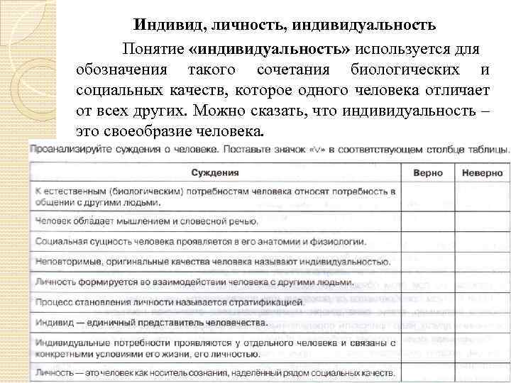 Индивид, личность, индивидуальность Понятие «индивидуальность» используется для обозначения такого сочетания биологических и социальных качеств, которое одного человека отличает от всех других. Можно сказать, что индивидуальность – это своеобразие человека.