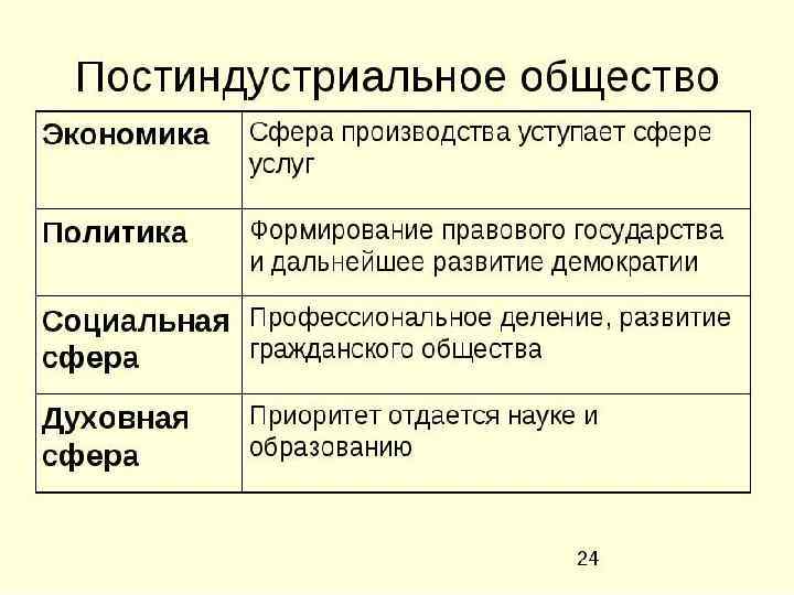 ПОСТИНДУСТРИАЛЬНОЕ (ИНФОРМАЦИОННОЕ) Отрасль хозяйства Темпы развития Общество делится на Мобильность Психология Форма правления Отношение к природе ГЛАВНАЯ ЦЕННОСТЬ Сфера услуг, компьютерные технологии, наука Ускорение Страты Высокая Индивидуализм Демократия, правовое государство Преобразует Информация Глобализм, глобальные проблемы, средний и мелкий бизнес, НТР