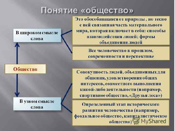 Общество в широком смысле в узком смысле Общество в широком смысле слова – обособившаяся от природы, но тесно связанная с ней часть материального мира, которая включает в себя: способы взаимодействия людей; формы объединения людей. Всё человечество в прошлом, современности перспективе.