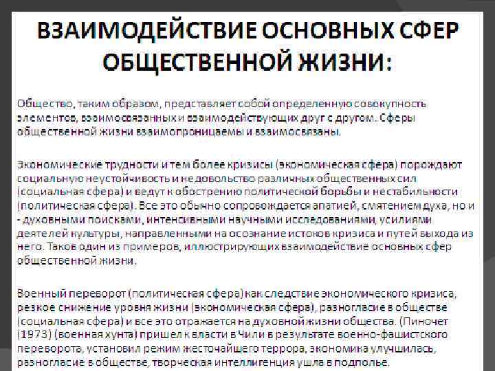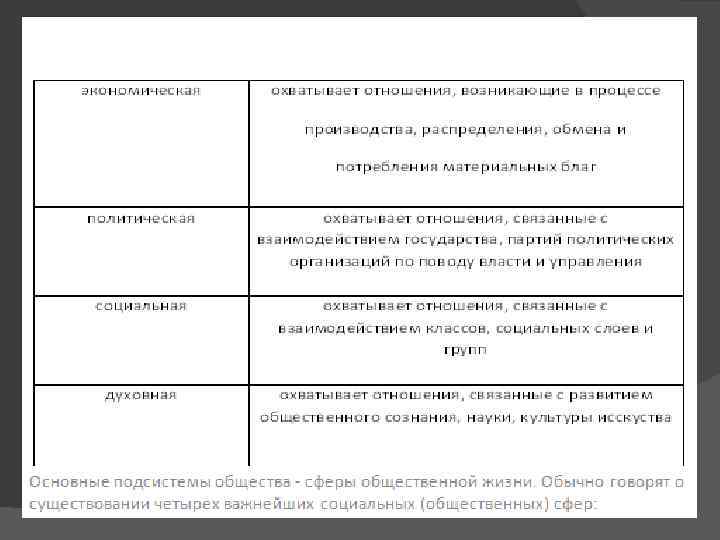 Данные подсистемы (сферы), в свою очередь, могут быть представлены совокупностью входящих в них элементов: * экономическая - производственные учреждения (заводы, фабрики), учреждения транспорта, фондовые и товарные биржи, банки и т. п. , * политическая - государство, партии, профсоюзы, молодежные, женские и пр. организации и т. п. , * социальная - классы, страты, социальные группы и слои, нации и т. п. , * духовная - церковь, образовательные учреждения, научные учреждения и т. п.