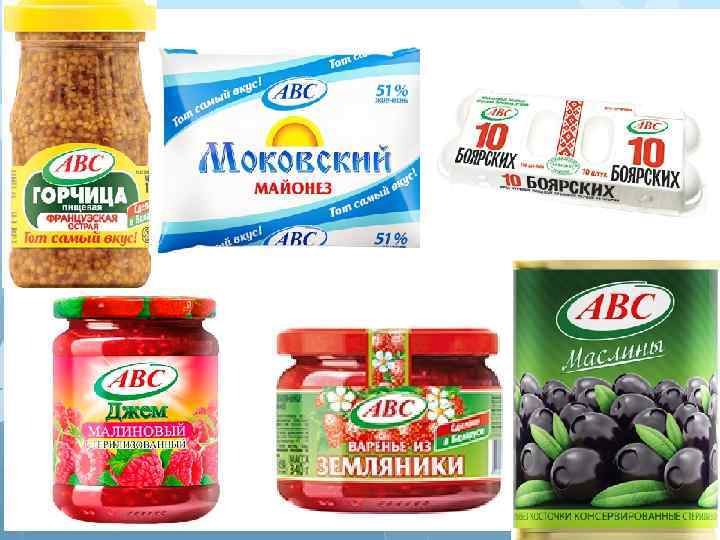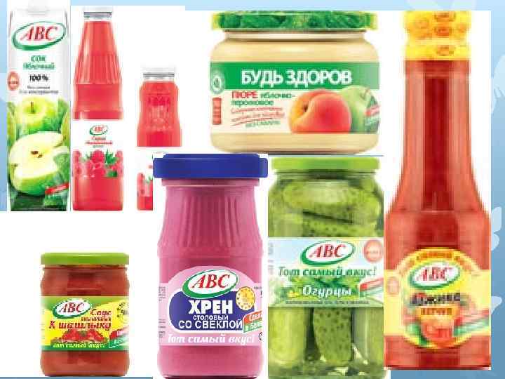 ОДО «фирма ABC» . ПРОДУКЦИЯ: • Соки • Кетчупы и майонезы • Хрен и горчица • Пюре • Яйца • Консервация • Овощная консервация • Варенье и джемы