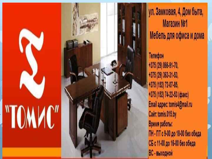 С 1995 года компания «Томис» успешно работает на мебельном рынке Беларуси и зарекомендовала себя надежным партнером как у производителей мебели, так и у потребителей. Продажа качественной, современной офисной, корпусной мебели в Гродно и других городах, отвечающим современным требованиям, является основной целью компании.