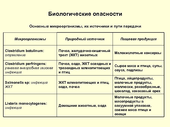 Биологические опасности Основные микроорганизмы, их источники и пути передачи Микроорганизмы Природный источник Пищевая продукция Clostridium botulinum: отравление Почва, желудочно-кишечный Малокислотные консервы тракт (ЖКТ) животных Clostridium perfringens: раневая анаэробная газовая инфекция Почва, вода, ЖКТ всеядных и Сырое мясо и птица, супы, травоядных млекопитающих соуса, подливы и птиц Salmonella sp: инфекция ЖКТ Listeria monocytogenes: инфекция ЖКТ млекопитающих и птиц, вода, почва Птица, яйцепродукты, молочные продукты, моллюски, ракообразные, шоколад, кокосовый орех Домашние животные, вода Молочные продукты, мясопродукты в вакуумной упаковке, свежее мясо птица и овощи